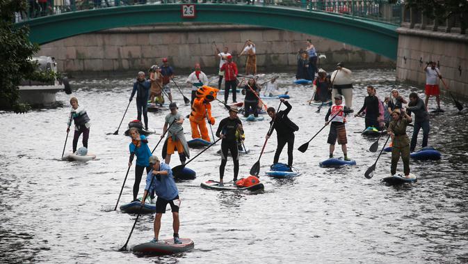 Orang-orang mendayung "paddle board" di sepanjang Sungai Fontanka pada festival SUP (Stand Up Paddle)-Surfing di St.Petersburg, Rusia, Minggu (12/8). Dalam paddling, mereka menggerakkan papannya dengan cara mendayung sambil berdiri. (AP/Dmitri Lovetsky)