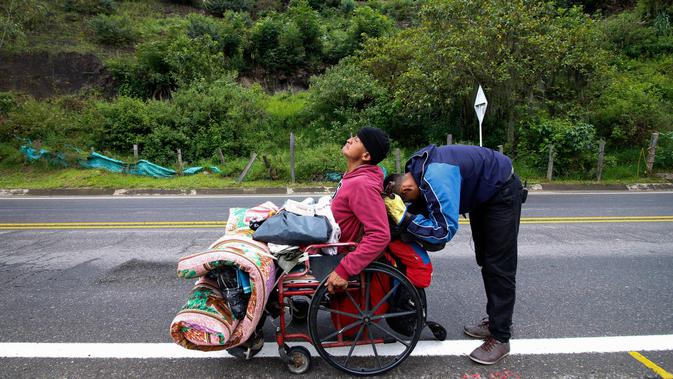 Migran Venezuela, Jefferson Alexis dan ayahnya, Jose Agustin Lopez, duduk di kursi roda, beristirahat ketika melakukan perjalanan yang menghubungkan Cucuta dan Pamplona di Norte de Santander Department, Kolombia, 15 September 2018. (AFP/SCHNEYDER MENDOZA)