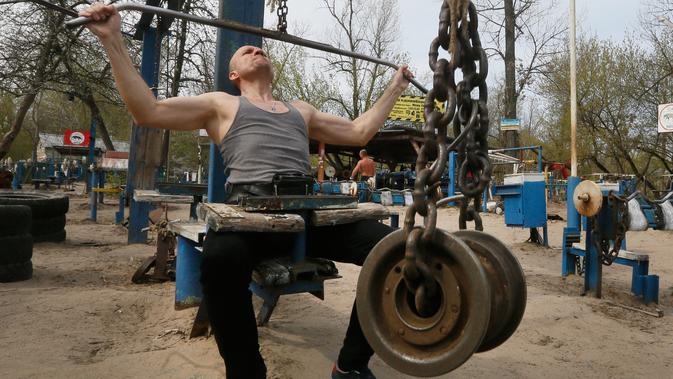 Seorang pria berlatih mengangkat beban tubuhnya di outdoor gym atau pusat kebugaran terbuka di tepi Sungai Dnipro, Kiev, Ukraina, Kamis (18/4). Meskipun kurang mewah, tempat kebugaran ini ternyata banyak peminatnya. (AP Photo/Efrem Lukatsky)