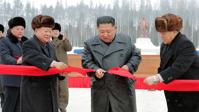 Pemimpin Korea Utara Kim Jong-un (tengah) melambaikan tangan saat menghadiri upacara peresmian Kota Samjiyon di Korea Utara, Senin (2/12/2019). Kota Samjiyon dilengkapi dengan sejumlah fasilitas komersial, budaya, dan medis termasuk apartemen, hotel, dan resor ski. (STR/AFP/KCNA MELALUI KNS)