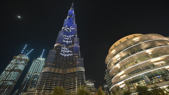 Foto yang diambil pada 4 Januari 2020 memperlihatkan pertunjukan cahaya menyinari Burj Khalifa, bangunan tertinggi dunia, di Dubai. Burj Khalifa yang resmi dibuka pada 4 Januari 2010 itu merayakan hari jadinya yang ke-10 dengan pertunjukan lampu LED khusus. (Giuseppe CACACE / AFP)
