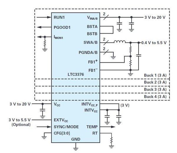 LTC3376 結合4個獨立降壓穩壓器通道,以及8個可設定1.5安培供電級,搭配彈性定序與故障監視,可用輸出電流達到12安培。LTC3376的尖峰降壓效率為96%,所有通道的輸出電壓精準度達到正負1%。每個通道可供應3至20V的獨立輸入供電,輸出電壓範圍最低可達0.4V。相鄰輸出通道可與一個共用電感並聯,藉以簡化電路。直流對直流轉換器可透過調整CFG0 至CFG3針腳,設定成15種供電組態。此外,這種設計不需外部鈦酸鍶鋇(BST)電容,因為BST電容已經整合在元件封裝內。