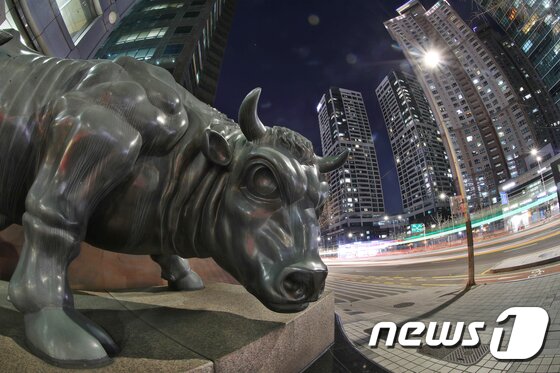 | 2021년 신축년(辛丑年) '소의 해'를 앞두고 서울 영등포구 여의도 금융투자협회 앞 황소상 뒤로 영겁의 시간이 지나가듯 차량 불빛 행렬이 이어지고 있다. 020.12.27/뉴스1 © News1 송원영 기자 |