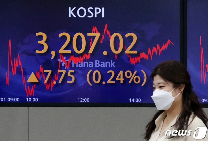 | (서울=뉴스1) 박세연 기자 = 1일 서울 중구 하나은행 명동점 딜링룸 전광판에 코스피지수가 전거래일 대비 7.75(0.24%) 포인트 오른 3,207.02을 나타내고 있다. 이날 코스피는 외국인 매수세에 상승마감해 13거래일만에 3200선을 탈환했다. 원달러 환율은 2.3원 내린 1,157.2원에 마감했다. 2021.9.1/뉴스1 |